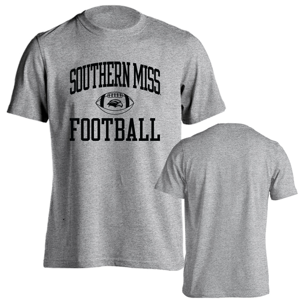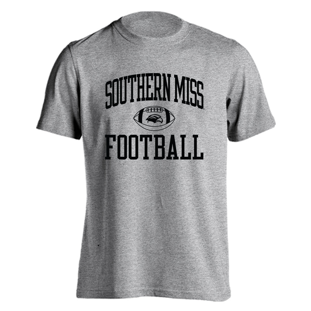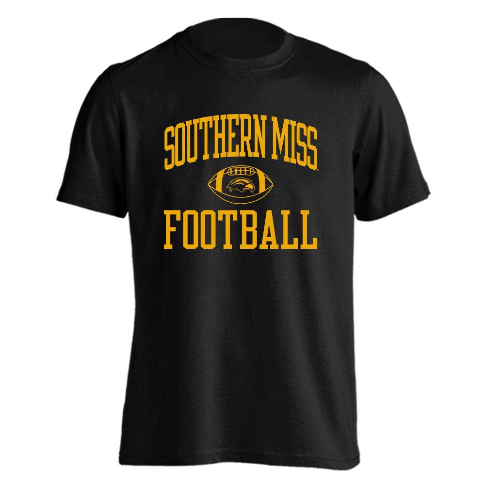 Fly high with the Sport Your Gear Southern Miss Golden Eagles Football T-Shirt, part of the Game Day Traditions Collection. Featuring a clean football graphic and the Southern Miss name across the chest, this shirt brings “To The Top” energy to every Saturday. Crafted from lightweight ringspun cotton or a cotton/poly blend for heather styles, it’s made to perform wherever you rep the black and gold.